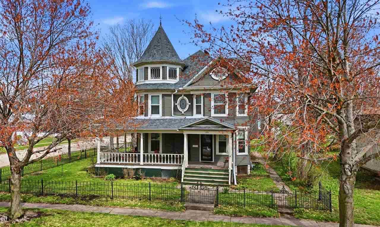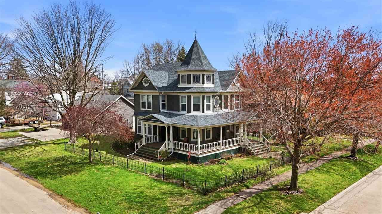 Step into a piece of history with this charming 1902 home offering timeless character blended with thoughtful updates. Situated on a corner lot, this grand 4-bedroom residence showcases stunning original details including wide woodwork, working pocket doors, two decorative fireplaces, a curved open staircase, beveled leaded glass windows, & a cozy window seat nook. The main level features a welcoming formal entry, elegant parlor, & formal dining room with detailed hardwood floors throughout. A second butler's staircase connects the upper level directly to the kitchen, adding both charm & functionality. Upstairs you'll find a unique sliding French door at the top of the stairs & four generously sized bedrooms. Enjoy outdoor living on the wraparound porch, 3-season back porch, or patio?perfect for relaxing or entertaining. Spacious three car garage. Major updates include a new house roof (2026), new electric water heater (2026), new boiler for the furnace (2025), & many newer windows. Electrical & plumbing have been updated by a previous owner. RO system. Walk up attic great for storage. The garage roof is approximately 15 yrs old. The fireplaces have been removed externally & are decorative only. Laundry is located in the basement with LG washer & dryer staying. Maple wood floors under the kitchen vinyl. A rare opportunity!