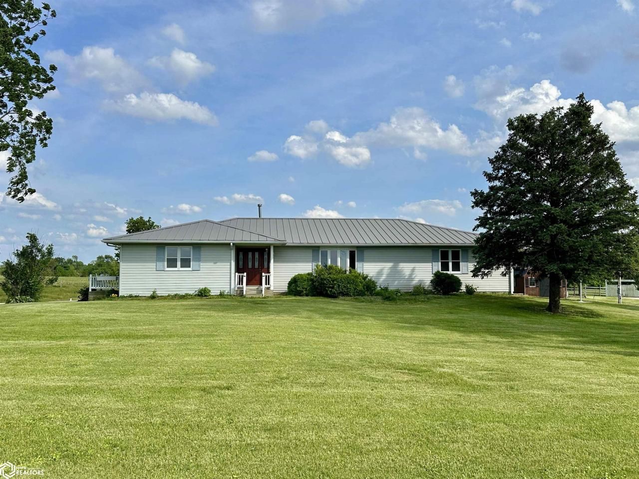 Nestled on a sprawling 5-acre lot, this charming 3-bedroom, 3-bathroom ranch offers a perfect blend of comfort and versatility. The main floor features three spacious bedrooms, including a primary suite with a master bath and a small private deck, ideal for morning coffee or unwinding in the evening. An additional full bath serves the other two bedrooms. The large eat-in kitchen, complete with a cozy breakfast nook, flows seamlessly into the dining room area, which boasts sliding glass doors leading to a generous deck overlooking the scenic acreage. The walk-out basement is a standout feature, opening to a patio area and providing additional living space. It includes three non-conforming bedrooms or office spaces, a second full kitchen, and a third full bath. This lower level also features a large living and entertainment area, perfect for hosting gatherings or creating a private retreat. Outside, the property is designed for relaxation and entertaining. A large pergola with fire pit and lighting creates an inviting atmosphere for outdoor get-togethers. The home also includes a 2-car attached garage, ensuring ample parking and storage space. Recent updates add to the home's appeal, including a new metal roof installed in May 2023. With natural gas service, this home eliminates the need for LP, offering convenience and efficiency. Embrace the tranquil country lifestyle with all the modern amenities in this well-maintained ranch home.